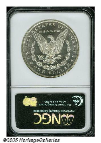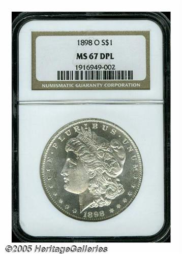 <B>1898-O<S$1> MS67 Deep Mirror Prooflike NGC.</B></I> While a common coin in MS65 and lower grades, the 1898-O is rarely located in Superb condition. Additionally, it is very rare with deeply mirrored prooflike fields. When those two qualifiers are applied, the 1898-O is a condition rarity among late-date dollars. This is the only NGC-certified MS67 DPL, and PCGS has only graded two pieces with one finer (6/05). This is an absolutely stunning coin. Brilliant throughout, the surfaces are virtually perfect with no mentionable abrasions. The striking details are intricately detailed with needle-sharp definition over the ear of Liberty as well as on the eagle's breast. Noticeable cameo contrast is also apparent between the fields and devices.