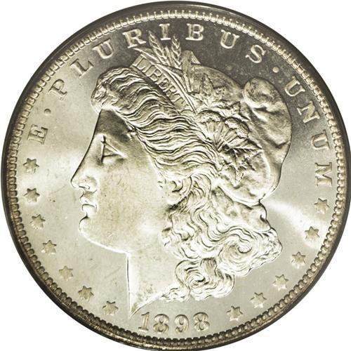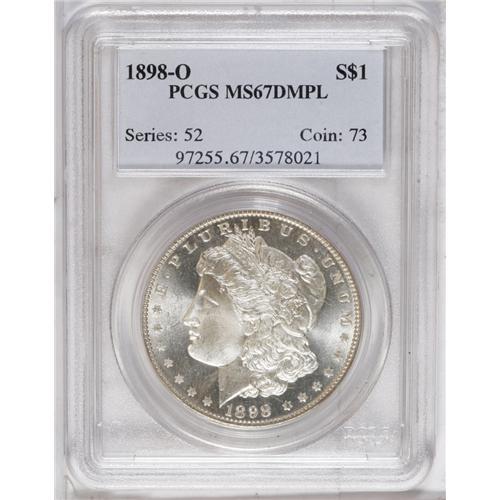 <B>1898-O<img border='0' src='http://www.heritagecoins.com/images/star.gif' width=10 height=10>$1> MS67 Deep Mirror Prooflike PCGS.</B></I> While a common coin in MS65 and lower grades, the 1898-O is rarely located in Superb condition. Additionally, it is very rare with deeply mirrored prooflike fields. When those two qualifiers are applied, the 1898-O is a condition rarity among late-date dollars. This is one of only two PCGS-certified MS67 DMPL (with one finer), NGC has only graded one MS67 DPL piece (7/06). This is an absolutely stunning coin. Essentially brilliant throughout, the surfaces are virtually perfect with no mentionable abrasions. The striking details are intricately detailed with needle-sharp definition over the ear of Liberty as well as on the eagle's breast. Noticeable cameo contrast is also apparent between the fields and devices.