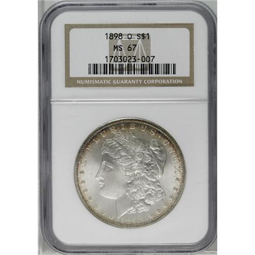 <B>1898-O<img border='0' src='http://www.heritagecoins.com/images/star.gif' width=10 height=10>$1> MS67 NGC.</B></I> Although it is another of many common date Morgan dollars, it is important to understand that the present example represents the finest available quality, unless you are the owner of the single finer MS68 example that has been certified by NGC. Sharply struck and highly lustrous with frosty silver surfaces accented by peripheral gold and iridescent toning.