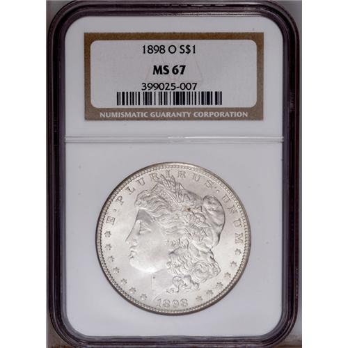 <B>1898-O<img border='0' src='http://www.heritagecoins.com/images/star.gif' width=10 height=10>$1 MS67 NGC.</B></I> Bright radiantly lustrous surfaces are nearly untoned, save for a hint of occasional tan color at the borders. The hair over Liberty's ear is a tad soft, but the design features are generally well impressed. A tiny mark on the cheekbone and another on the eagle's breast are mentioned for accuracy. Census: 92 in 67, 1 finer (1/06).