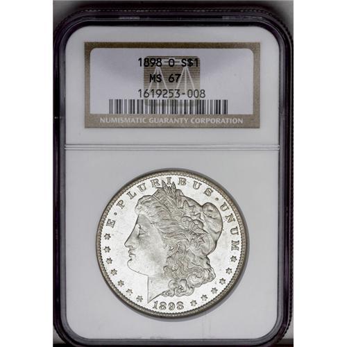 <B>1898-O<img border='0' src='http://www.heritagecoins.com/images/star.gif' width=10 height=10>$1> MS67 NGC.</B></I> In spite of the large numbers of this issue that were released by the government in the early '60s, this is a surprisingly scarce dollar in Superb condition. This is a brilliant example that is nearly flawless. The surfaces are smooth and satiny and the central design elements are fully brought up. An outstanding 1898-O dollar.