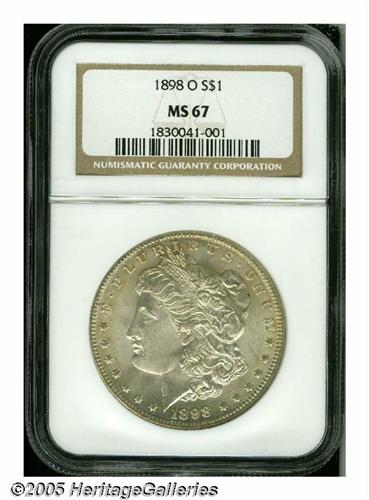<B>1898-O<S$1> MS67 NGC.</B></I> Superb surfaces overall with bright, coruscating luster. There are virtually no significant abrasions on either side, and the coin is nearly brilliant except for scattered bits of russet and golden color on both obverse and reverse. The design elements are sharply struck, except for a touch of softness in the hair above Liberty's ear. Population: 64 in 67, 1 finer (4/05).