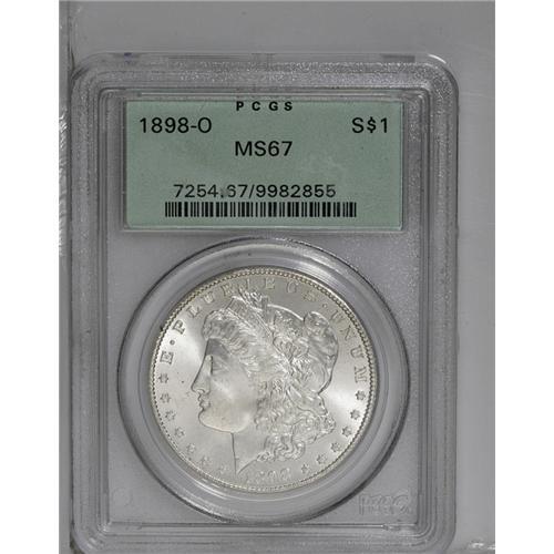 <B>1898-O<img border='0' src='http://www.heritagecoins.com/images/star.gif' width=10 height=10>$1> MS67 PCGS.</B></I> A brilliant Superb Gem with a solid strike for this issue. While large quantities were released by the Treasury in the early 1960s, few were as nice as this coin. In fact, PCGS has graded none finer (6/06). Housed in a green label holder.