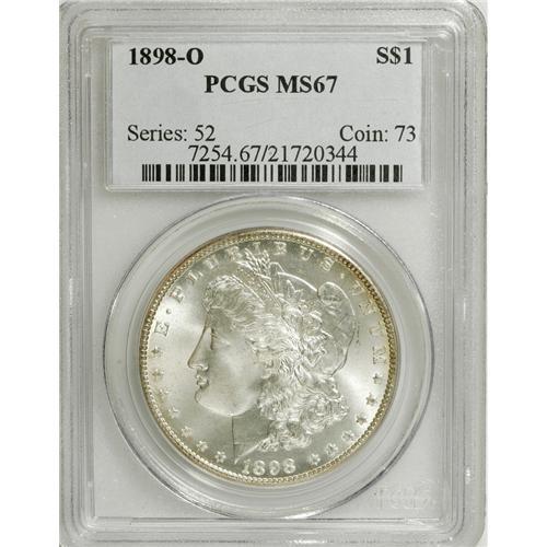<B>1898-O S$1 MS67 PCGS.</B></I> Sharply struck with pleasing mint luster and mostly untoned surfaces that reveal a slight degree of golden peripheral toning on the reverse. The surfaces are nearly blemish-free, as expected.<BR><BR><b>Shipping:</b> Coins & Currency (<a target="_blank" href="http://www.heritageauctions.com/common/shipping.php">view shipping information</a>)