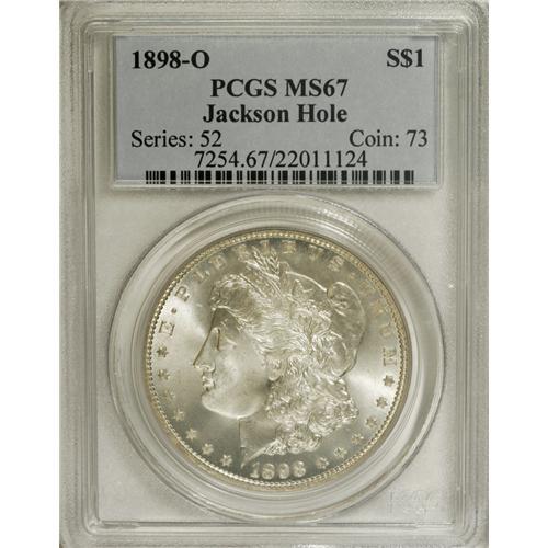<B>1898-O S$1 MS67 PCGS.</B></I> Ex: Jackson Hole. Though the Treasury releases transformed the 1898-O from a key date to common, avid collectors continue to pursue the finest examples. With its essentially untoned surfaces, creamy luster, and above-average detail, this Superb Gem conveys remarkable visual appeal. Tied for the highest-graded example certified by PCGS (2/07).<BR><I>From The Jackson Hole Collection.</B></I><BR><BR><b>Shipping:</b> Coins & Currency (<a target="_blank" href="http://www.heritageauctions.com/common/shipping.php">view shipping information</a>)
