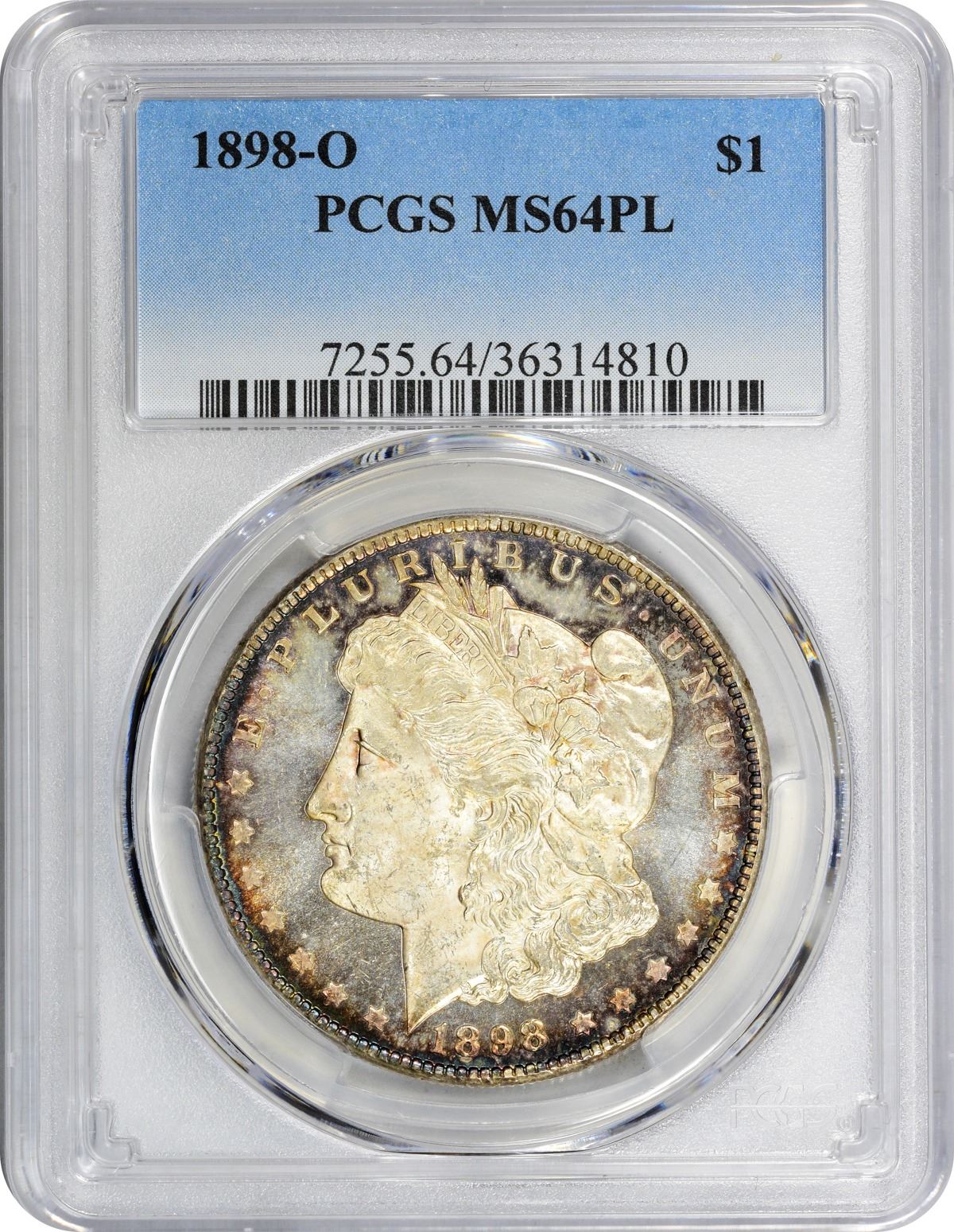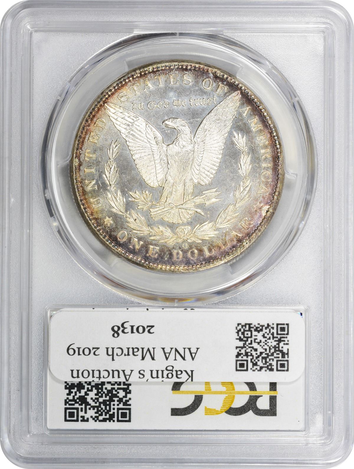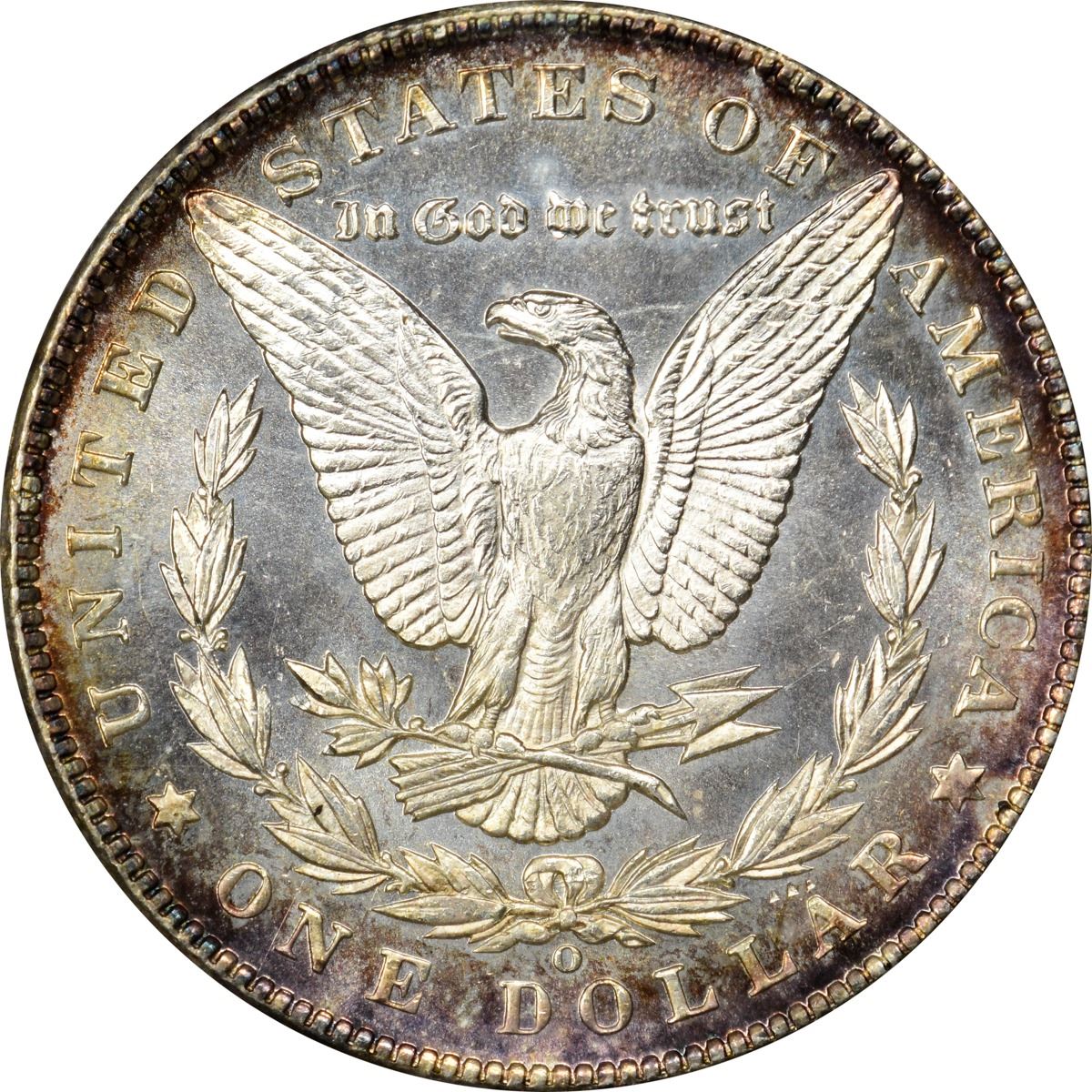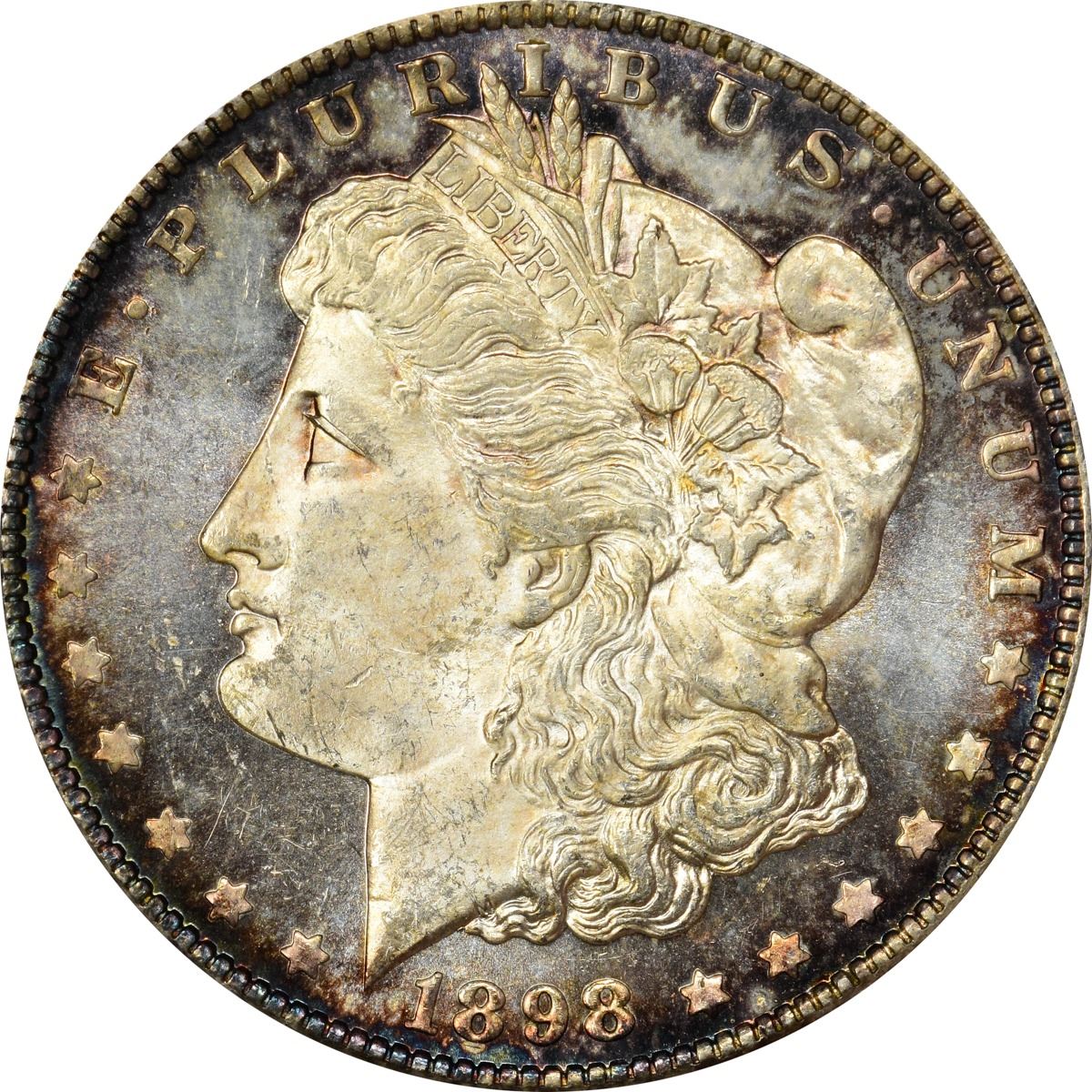 The frosted motifs and richly mirrored fields are aglow with bold cartwheel activity and offer a vibrant display of deep gold, crimson, violet, and blue iridescence at the rims. PCGS #7255