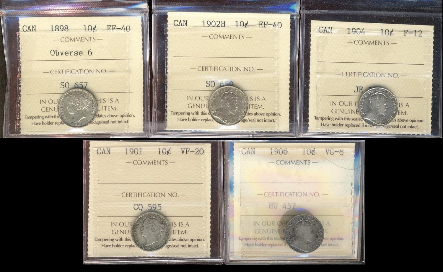 1898 Obv 6, 1902H EF40, 1901 VF20, 1904 F12 & 1906 VG8 10¢. Lot of 5 coins all certified ICCS/CCCS.