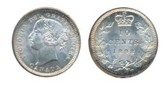1898. Obverse port. #6. ICCS Mint State-65. A strongly struck, fully lustrous gem Victorian ten cents piece. Tied with three others for the ‘Finest’ graded by ICCS.