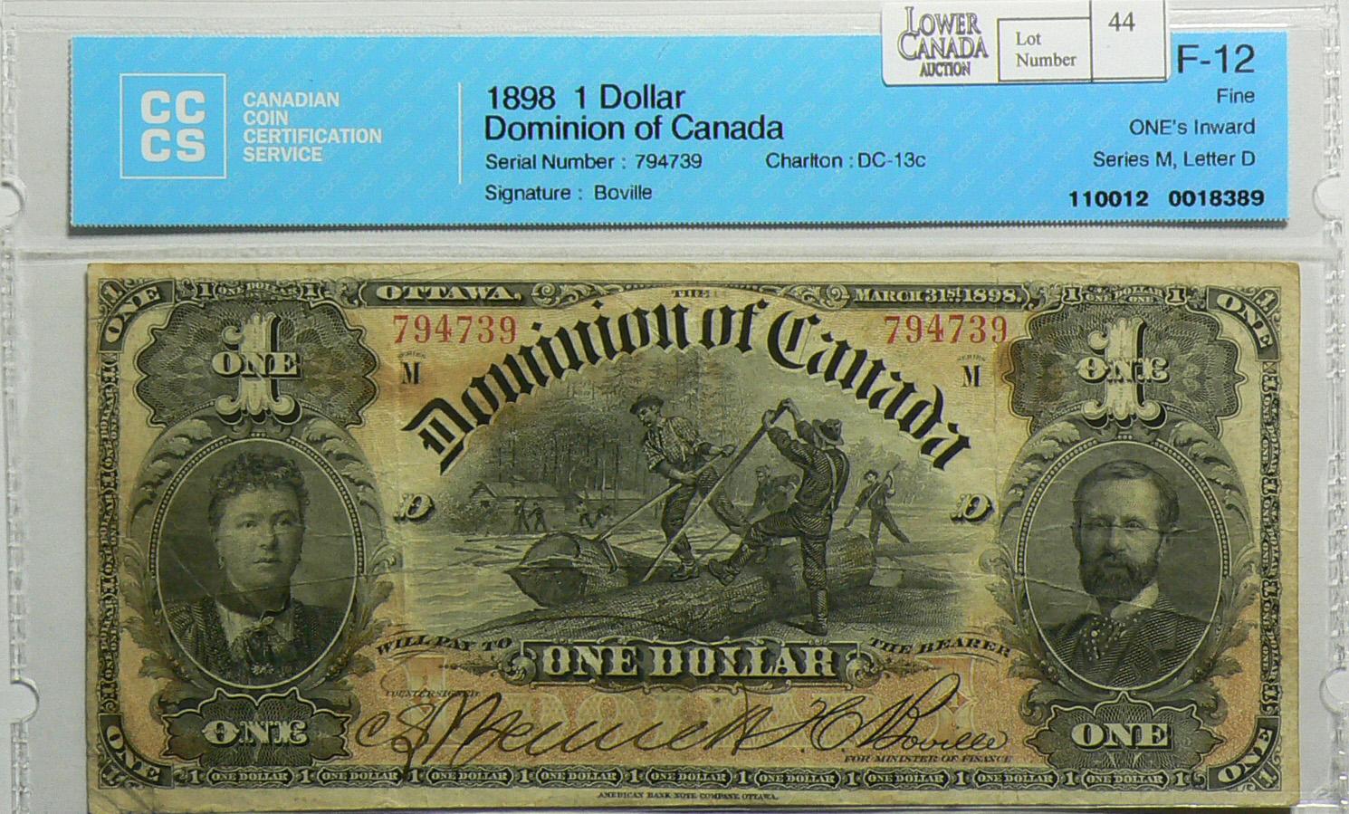 1898 One Dollar, DC-13c, CCCS F-12, Boville, ONE's Inward, Series M, Letter D, serial 794739.