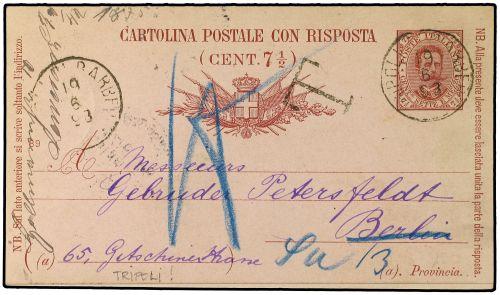 1898 Postal stationery 7½ c. red on rose reply card used to Berlin cancelled ´Tripoli Di Barbarie´ cds´s. Unusual usage and taxed on arrival (June 24).