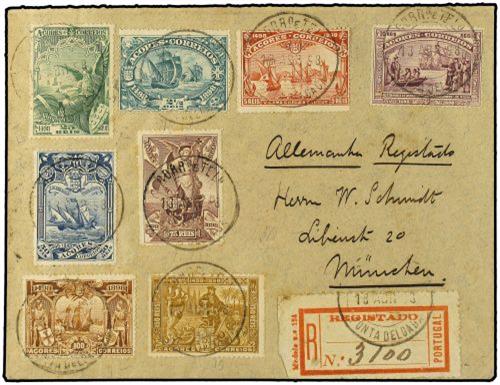 1898 Registered cover from Ponte Delgada to Munich franked by Azores April 1898 Vasco Da Gama issue complete set of eight all tied by neat cds´s. Scarce and fine usage. Backstamped (April 22) at Lisbon and Munich. Scott 93-100.