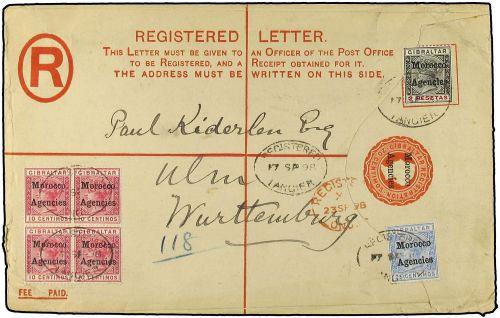 1898 Registered postal stationary envelope 20 centimes red upgraded with 5 cents green (block of 21) (SG 1), 10 cents carmine (block of 4) (SG 2), 25 cents blue (SG 4) and 2 pesetas black and carmine (SG 8) tied by oval registered TANGIER datestamp routed via London addressed to Germany with ULM arrival on reverse. Spectacular franking.