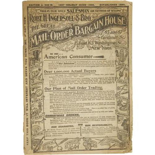 <B>1898 Robert H. Ingersoll & Brothers Holiday Mail Order Catalog</B></I>. 128 pages, 7.5” x 10.5”, uniformly toned with age, several pages chipped at the lower right corner, chipped at the edges, a few tears, holes, etc., else good condition. The Robert H. Ingersoll “Mail Order Bargain House” of New York City provided a wealth or useful and not-so-useful products. This catalog could provide everything a mid-western farmer might need. <I>Ex. Henry E. Luhrs Collection</B></I>.<BR><BR><b>Shipping:</b> Flat Material, Small (<a target="_blank" href="http://www.heritageauctions.com/common/shipping.php">view shipping information</a>)