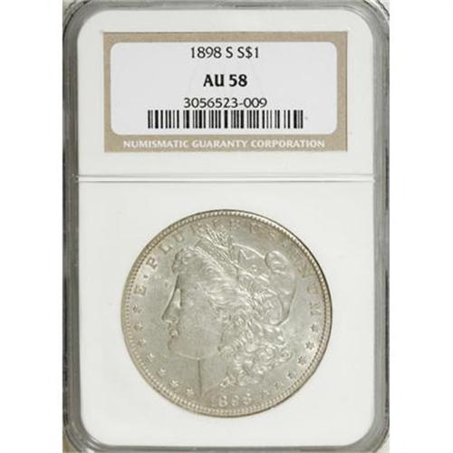 <B>1898-S $1 AU58 NGC.</B></I> . NGC Census: (162/1423). PCGS Population (160/2913). Mintage: 4,102,000. Numismedia Wsl. Price for NGC/PCGS coin in AU58: $117. (#7256)<BR><BR><B>Coin Engraver:</B> George T. Morgan<BR><BR><b>Shipping:</b> Coins & Currency (<a target="_blank" href="http://www.heritageauctions.com/common/shipping.php">view shipping information</a>)