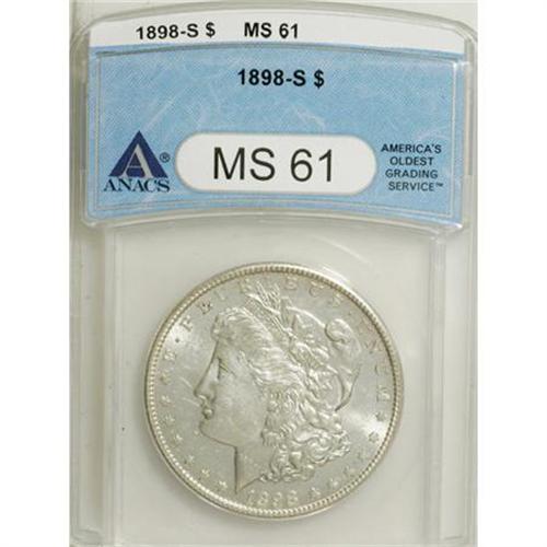 <B>1898-S $1 MS61 ANACS.</B></I> A lustrous and untoned S-mint dollar kept from a higher grade by a patch of faint slide marks on the cheek.<BR><BR><b>Shipping:</b> Coins & Currency (<a target="_blank" href="http://www.heritageauctions.com/common/shipping.php">view shipping information</a>)