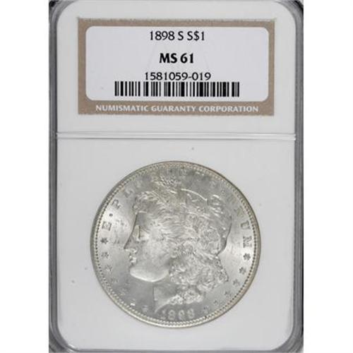 <B>1898-S $1 MS61 NGC.</B></I> NGC Census: (93/1284). PCGS Population (118/2696). Mintage: 4,102,000. Numismedia Wsl. Price for NGC/PCGS coin in MS61: $200. (#7256)<BR><BR><B>Coin Engraver:</B> George T. Morgan<BR><BR><b>Shipping:</b> Coins & Currency (<a target="_blank" href="http://www.heritageauctions.com/common/shipping.php">view shipping information</a>)