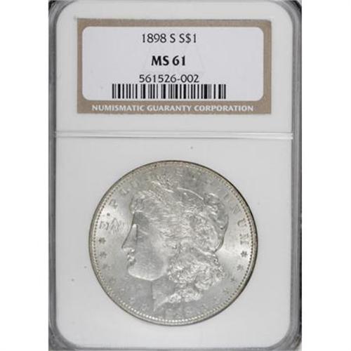 <B>1898-S $1 MS61 NGC.</B></I> NGC Census: (93/1284). PCGS Population (118/2696). Mintage: 4,102,000. Numismedia Wsl. Price for NGC/PCGS coin in MS61: $200. (#7256)<BR><BR><B>Coin Engraver:</B> George T. Morgan<BR><BR><b>Shipping:</b> Coins & Currency (<a target="_blank" href="http://www.heritageauctions.com/common/shipping.php">view shipping information</a>)