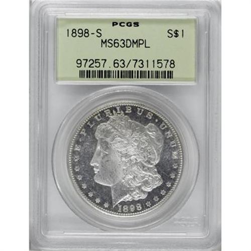 <B>1898-S $1 MS63 Deep Mirror Prooflike PCGS.</B></I> This sharply struck and virtually brilliant silver dollar has impressively mirrored fields. The distributed minor contact is customary for the grade. Housed in an old green label holder. Population: 34 in 63 DMPL, 34 finer (3/08).<BR><BR><b>Shipping:</b> Coins & Currency (<a target="_blank" href="http://www.heritageauctions.com/common/shipping.php">view shipping information</a>)
