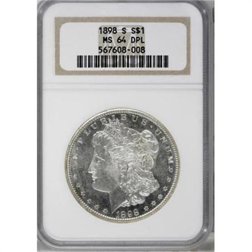 <B>1898-S $1 MS64 Deep Mirror Prooflike NGC.</B></I> The 1898-S, with a mintage exceeding 4 million pieces, is one of the more common Morgan dollars, though Deep Mirror Prooflike specimens are much more challenging. This near-Gem displays pleasing field-device contrast. Wisps of light tan color make occasional visits, particularly on the reverse, and an attentive strike leaves sharp definition on the design elements. Some light obverse marks preclude full Gem classification. Census: 17 in 64 Deep Mirror Prooflike, 1 finer (11/07).<BR><BR><b>Shipping:</b> Coins & Currency (<a target="_blank" href="http://www.heritageauctions.com/common/shipping.php">view shipping information</a>)