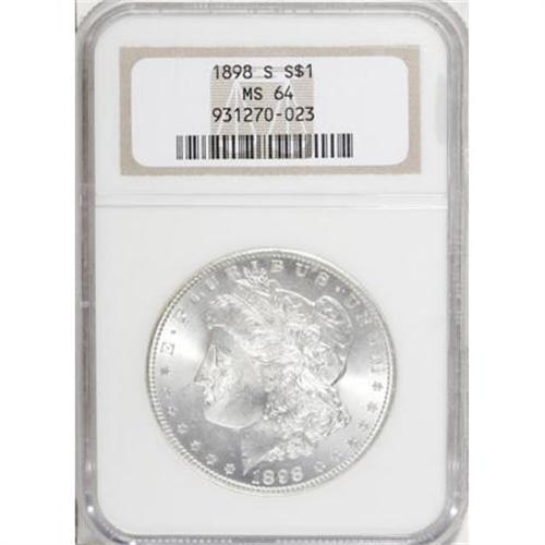 <B>1898-S $1 MS64 NGC.</B></I> VAM-6. The mintmark is clearly repunched south. A lightly toned and highly lustrous silver dollar with a good strike and a few minor obverse grazes.<BR><BR><B>Coin Engraver:</B> George T. Morgan<BR><BR><b>Shipping:</b> Coins & Currency (<a target="_blank" href="http://www.heritageauctions.com/common/shipping.php">view shipping information</a>)