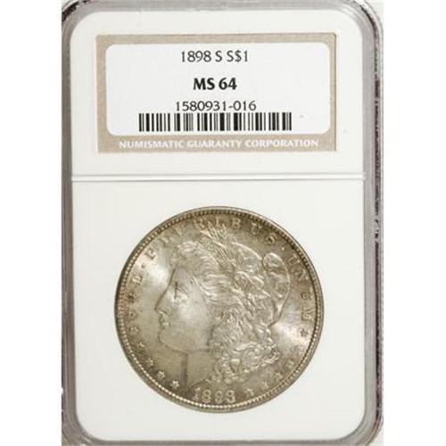 <B>1898-S $1 MS64 NGC.</B></I> NGC Census: (516/105). PCGS Population (979/384). Mintage: 4,102,000. Numismedia Wsl. Price for NGC/PCGS coin in MS64: $685. (#7256)<BR><BR><B>Coin Engraver:</B> George T. Morgan<BR><BR><b>Shipping:</b> Coins & Currency (<a target="_blank" href="http://www.heritageauctions.com/common/shipping.php">view shipping information</a>)