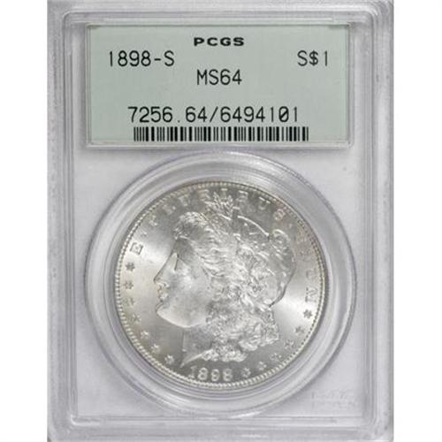 <B>1898-S $1 MS64 PCGS.</B></I> Well struck and strongly lustrous with an essentially untoned obverse that yields to lovely magenta, orange, pink, and pale blue-gray colors on the reverse. An attractive example of an issue that becomes elusive any finer. Certified in an old green label holder.<BR><BR><b>Shipping:</b> Coins & Currency (<a target="_blank" href="http://www.heritageauctions.com/common/shipping.php">view shipping information</a>)