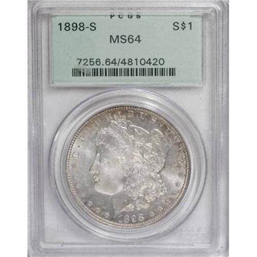 <B>1898-S $1 MS64 PCGS.</B></I> <B>1898-S S$1 MS64 PCGS.</B></I> This flashy, nicely struck near-Gem has autumn-red toning around the rims. Surface marks are minimal for the grade. An upper-end example of this later date S-mint, housed in a green label PCGS holder. <BR><BR><b>Shipping:</b> Coins & Currency (<a target="_blank" href="http://www.heritageauctions.com/common/shipping.php">view shipping information</a>)