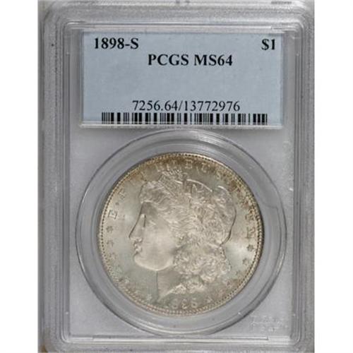 <B>1898-S $1 MS64 PCGS.</B></I> A frosty near-Gem with hints of gold toning along the borders. An ideal grade for the date, perhaps the best combination of price and quality.<BR><BR><B>Coin Engraver:</B> George T. Morgan<BR><BR><b>Shipping:</b> Coins & Currency (<a target="_blank" href="http://www.heritageauctions.com/common/shipping.php">view shipping information</a>)
