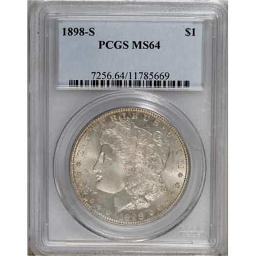 <B>1898-S $1 MS64 PCGS.</B></I> PCGS Population (982/385). NGC Census: (519/105). Mintage: 4,102,000. Numismedia Wsl. Price for NGC/PCGS coin in MS64: $685. (#7256)<BR><BR><B>Coin Engraver:</B> George T. Morgan<BR><BR><b>Shipping:</b> Coins & Currency (<a target="_blank" href="http://www.heritageauctions.com/common/shipping.php">view shipping information</a>)