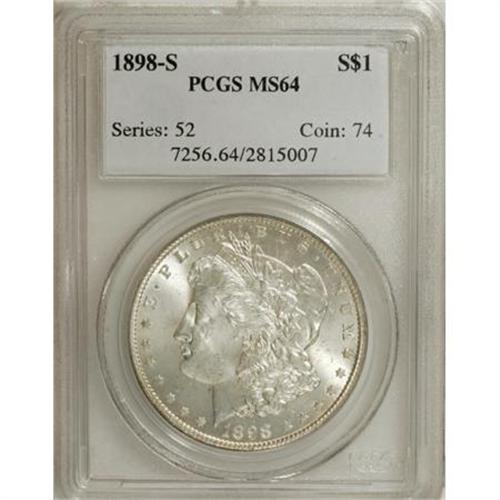 <B>1898-S $1 MS64 PCGS.</B></I> PCGS Population (982/385). NGC Census: (517/105). Mintage: 4,102,000. Numismedia Wsl. Price for NGC/PCGS coin in MS64: $685. (#7256)<BR><BR><B>Coin Engraver:</B> George T. Morgan<BR><BR><b>Shipping:</b> Coins & Currency (<a target="_blank" href="http://www.heritageauctions.com/common/shipping.php">view shipping information</a>)