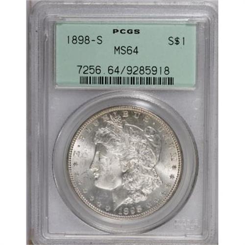<B>1898-S $1 MS64 PCGS.</B></I> An essentially brilliant near-Gem with dazzling luster and a clean obverse field. The cheek and the field above the arrowheads show moderate marks. Encased in an old green label holder.<BR><BR><B>Coin Engraver:</B> George T. Morgan<BR><BR><b>Shipping:</b> Coins & Currency (<a target="_blank" href="http://www.heritageauctions.com/common/shipping.php">view shipping information</a>)