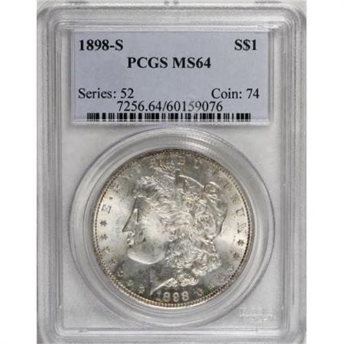 <B>1898-S $1 MS64 PCGS.</B></I> Splashes of tan and watermelon-red patina visit the margins of this strongly lustrous later S-mint issue. Well struck with more luster grazes than actual marks, though the piece falls just shy of Gem status overall.<BR><BR><B>Coin Engraver:</B> George T. Morgan<BR><BR><b>Shipping:</b> Coins & Currency (<a target="_blank" href="http://www.heritageauctions.com/common/shipping.php">view shipping information</a>)
