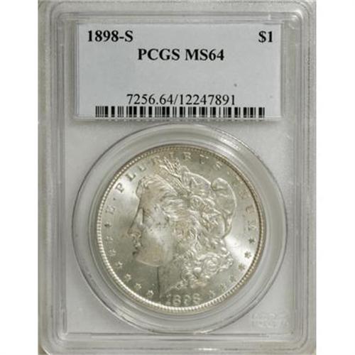 <B>1898-S $1 MS64 PCGS.</B></I> Powerful luster beneath a hint of haze. This later S-mint Morgan shows a few wispy marks on the portrait, though the overall appearance is clean. Whispers of silver-gray haze are the coin's only toning.<BR><BR><B>Coin Engraver:</B> George T. Morgan<BR><BR><b>Shipping:</b> Coins & Currency (<a target="_blank" href="http://www.heritageauctions.com/common/shipping.php">view shipping information</a>)