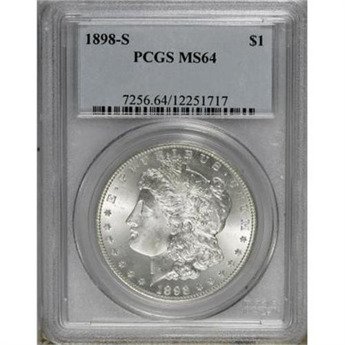 <B>1898-S $1 MS64 PCGS.</B></I> . PCGS Population (1016/400). NGC Census: (521/106). Mintage: 4,102,000. Numismedia Wsl. Price for NGC/PCGS coin in MS64: $685. (#7256)<BR><BR><B>Coin Engraver:</B> George T. Morgan<BR><BR><b>Shipping:</b> Coins & Currency (<a target="_blank" href="http://www.heritageauctions.com/common/shipping.php">view shipping information</a>)