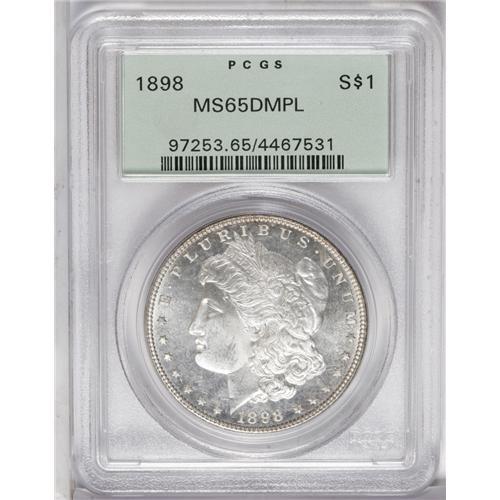 <B>1898<img border='0' src='http://www.heritagecoins.com/images/star.gif' width=10 height=10>$1> MS65 Deep Mirror Prooflike PCGS.</B></I> Dramatic reflectivity and clean fields ensure the eye appeal of this pinpoint-sharp Gem. This nearly brilliant example is housed in a green label holder. Population: 58 in 65, 12 finer (8/06).