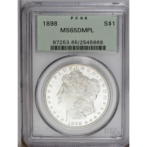 <B>1898<img border='0' src='http://www.heritagecoins.com/images/star.gif' width=10 height=10>$1> MS65 Deep Mirror Prooflike PCGS.</B></I> Bright, essentially untoned surfaces display sharply struck devices, though a touch of softness is noted in the hair over Liberty's ear. A few unobtrusive marks on Liberty's cheek and in the obverse fields do not significantly distract.