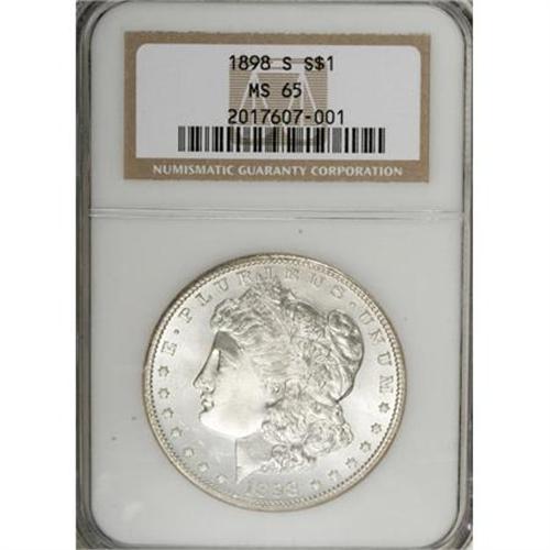 <B>1898-S $1 MS65 NGC.</B></I> Well struck with intense mint luster over untoned silver-white surfaces. The fields are flashy and semi-reflective. A few wispy marks are noted on each side. <BR><BR><B>Coin Engraver:</B> George T. Morgan<BR><BR><b>Shipping:</b> Coins & Currency (<a target="_blank" href="http://www.heritageauctions.com/common/shipping.php">view shipping information</a>)