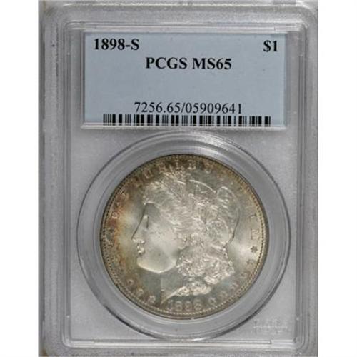 <B>1898-S $1 MS65 PCGS.</B></I> Golden-brown and sky-blue toning enriches the left obverse margin. This splendidly preserved Gem is nicely struck and highly attractive. A keeper in nearly any advanced collection.<BR><BR><B>Coin Engraver:</B> George T. Morgan<BR><BR><b>Shipping:</b> Coins & Currency (<a target="_blank" href="http://www.heritageauctions.com/common/shipping.php">view shipping information</a>)