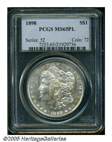 <B>1898<S$1> MS65 Prooflike PCGS.</B></I> Fully prooflike but not deeply so, with light contrast between the fields and devices. The obverse is splashed with golden-brown color and vivid yellow color. The reverse is entirely untoned.