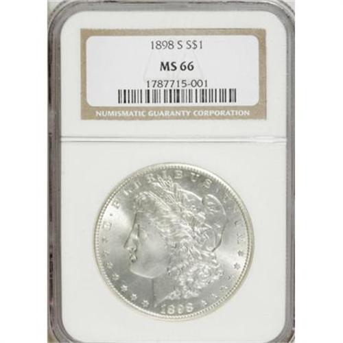 <B>1898-S $1 MS66 NGC.</B></I> A very satisfying Premium Gem, with extremely smooth surfaces and full, satiny luster unaffected by toning. The only mark worthy of note is a shallow and thin scratch between Liberty's eye and her nose. This is visible only at certain angles and but for this scratch, this example could be Superb. Census: 9 in 66, 1 finer (11/07).<BR><I>From The Motor City Collection.</B></I><BR><BR><B>Coin Engraver:</B> George T. Morgan<BR><BR><b>Shipping:</b> Coins & Currency (<a target="_blank" href="http://www.heritageauctions.com/common/shipping.php">view shipping information</a>)
