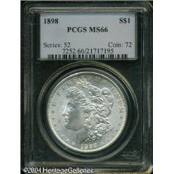 1898 S$1 MS66 PCGS. Bright silver-gray surfaces di <B>1898 S$1 MS66 PCGS.</B></I> Bright silver-gray surfaces display sharply defined motifs and strong luster. Some luster grazes on Liberty's cheek and neck are mentioned for accuracy. <BR><BR><B>Important notice:</B> Heritage usually auctions material at the rate of 200-250 lots per hour. On some occasions eBay Live bid software or the Internet may not be able to keep up with the pace of the auction. We recommend placing a realistic absentee bid now as insurance to avoid disappointment. Occasionally the auctioneer may eliminate or reject an eBay Live bid, and the auctioneer may also reopen a lot after the close of the eBay live bidding (usually because we missed an audience bid), and may reject your bid even if it shows you as the winning bidder. By bidding via eBay Live, you agree that Heritage may award the lot to another bidder at its sole discretion under the circumstances described above or any other reasonable circumstances. Since eBay bids are not shown to us until we open the lot on the floor, we treat those bids just like floor bids. In most cases the floor responds before the eBay bid is presented to us, due to Internet lag time, so for consistency we have made it a policy that floor bids are always considered first over tie eBay live bids. Also please note that all Heritage lots purchased through eBay Live carry a 20% Buyer's Premium. Please make sure you read the Terms and Conditions before you bid. This lot is being auctioned in conjunction with a live floor auction by Heritage Galleries & Auctioneers. All final auction and invoice information will be supplied by Heritage Galleries & Auctioneers, and all other information should be considered preliminary. Lot:7692