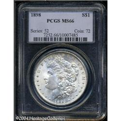 1898 S$1 MS66 PCGS. Virtually brilliant, this lust <B>1898 S$1 MS66 PCGS.</B></I> Virtually brilliant, this lustrous and meticulously struck premium Gem is lovingly preserved and has exceptional eye appeal. <BR><BR><B>Important notice:</B> Heritage usually auctions material at the rate of 200-250 lots per hour. On some occasions eBay Live bid software or the Internet may not be able to keep up with the pace of the auction. We recommend placing a realistic absentee bid now as insurance to avoid disappointment. Occasionally the auctioneer may eliminate or reject an eBay Live bid, and the auctioneer may also reopen a lot after the close of the eBay live bidding (usually because we missed an audience bid), and may reject your bid even if it shows you as the winning bidder. By bidding via eBay Live, you agree that Heritage may award the lot to another bidder at its sole discretion under the circumstances described above or any other reasonable circumstances. Since eBay bids are not shown to us until we open the lot on the floor, we treat those bids just like floor bids. In most cases the floor responds before the eBay bid is presented to us, due to Internet lag time, so for consistency we have made it a policy that floor bids are always considered first over tie eBay live bids. Also please note that all Heritage lots purchased through eBay Live carry a 20% Buyer's Premium. Please make sure you read the Terms and Conditions before you bid. This lot is being auctioned in conjunction with a live floor auction by Heritage Galleries & Auctioneers. All final auction and invoice information will be supplied by Heritage Galleries & Auctioneers, and all other information should be considered preliminary. Lot:7691