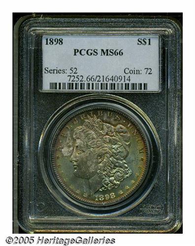 <B>1898<S$1> MS66 PCGS.</B></I> Well struck and highly lustrous, with a rich coating of sea-green, crimson, gold, and mauve-gray toning over both sides, and expertly preserved surfaces that seem entirely blemish-free. Several small fingerprint fragments rest on the upper obverse, reducing the overall eye appeal of the coin only slightly.