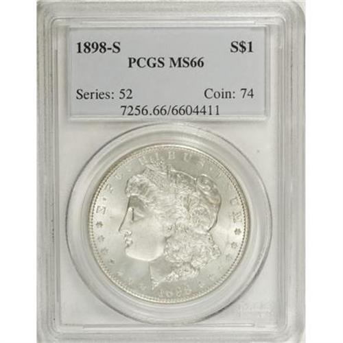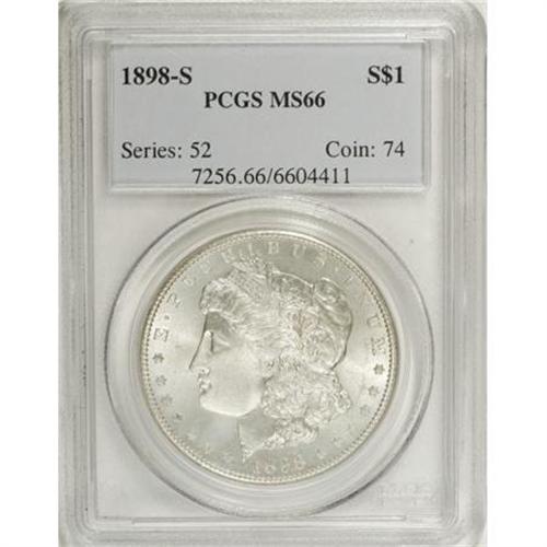 <B>1898-S $1 MS66 PCGS.</B></I> Wisps of gold-tan color around the margins show up under high magnification, and pleasing luster emanates from well cared for surfaces. An attentive strike resulted in relatively strong definition on the design features, though characteristic minor softness is apparent in the hair over Liberty's ear. Population: 58 in 66, 2 finer (6/07).<BR><I>From the Reuben Reinstein Collection.</B></I><BR><BR><b>Shipping:</b> Coins & Currency (<a target="_blank" href="http://www.heritageauctions.com/common/shipping.php">view shipping information</a>)