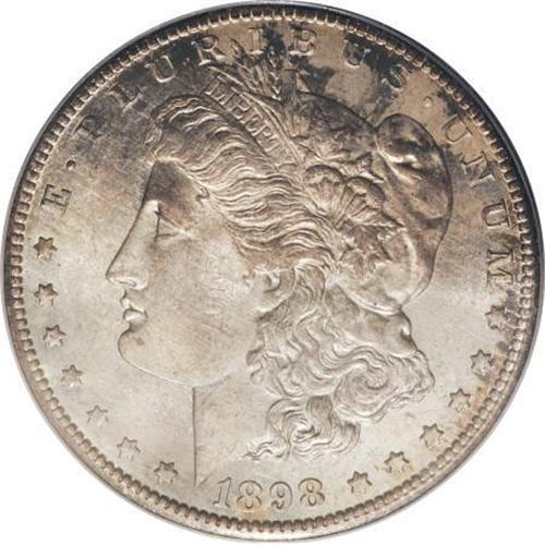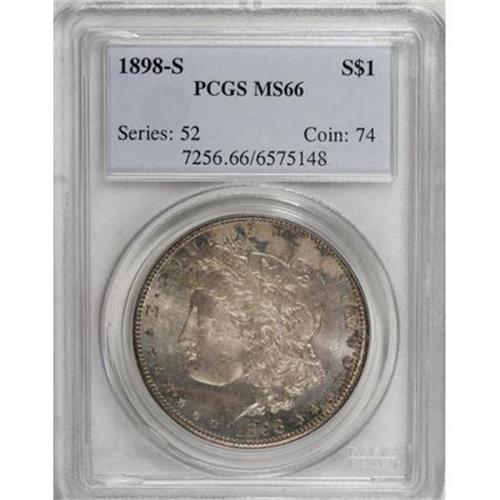 <B>1898-S $1 MS66 PCGS.</B></I> The 1898-S is decidedly scarce in high grades, in spite of its availability in lower Uncirculated condition. This is an especially attractive coin that has bright, semi-prooflike fields. These fields are strongly evident through the multiple (but light) layers of lilac and rose toning seen on each side. The cheek of Liberty is smooth, as one would expect from an MS66. Population: 58 in 66, 2 finer (8/07).<BR><BR><B>Coin Engraver:</B> George T. Morgan<BR><BR><b>Shipping:</b> Coins & Currency (<a target="_blank" href="http://www.heritageauctions.com/common/shipping.php">view shipping information</a>)