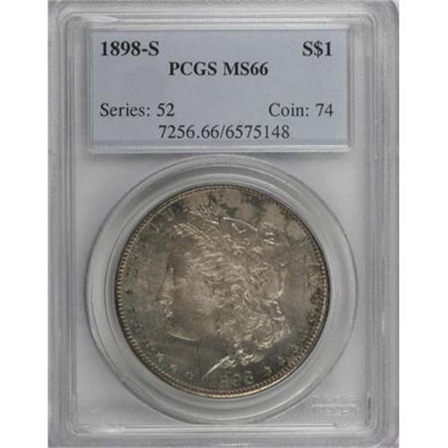 <B>1898-S $1 MS66 PCGS.</B></I> The 1898-S is decidedly scarce in high Mint State grades, in spite of its availability in lower Uncirculated condition. This is an especially attractive coin that has bright, semi-prooflike fields. These are strongly evident through the multiple (but light) layers of reddish-gold, ice-blue, lilac and rose toning, somewhat more prevalent on the reverse. There are a few light grade-consistent marks. Population: 58 in 66, 2 finer (3/08).<BR><I>From The Silver Spur Collection of Morgan Dollars.</B></I><BR><BR><B>Coin Engraver:</B> George T. Morgan<BR><BR><b>Shipping:</b> Coins & Currency (<a target="_blank" href="http://www.heritageauctions.com/common/shipping.php">view shipping information</a>)