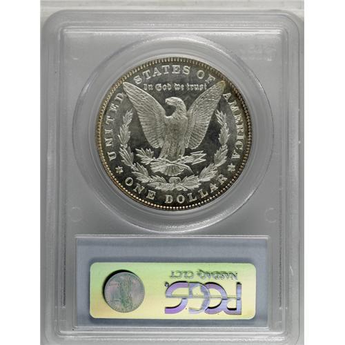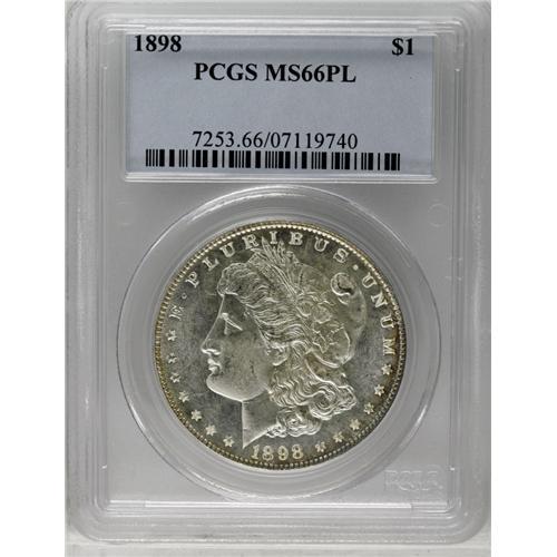 <B>1898<img border='0' src='http://www.heritagecoins.com/images/star.gif' width=10 height=10>$1> MS66 Prooflike PCGS.</B></I> This example sports moderate mirrors with slight haze and intermittent orange-red to blue-violet rim toning. Nicely struck with faint cameo contrast.