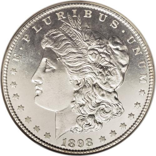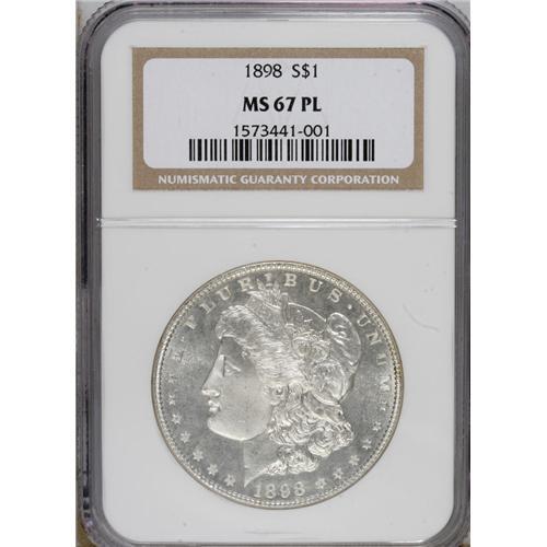 <B>1898 S$1 MS67 Prooflike NGC.</B></I> NGC and PCGS have certified approximately 1,000 1898 prooflike dollars; the finest seen of these (3/07) is offered in the present lot. Strong field-motif contrast becomes apparent when the piece is rotated beneath a light source, and all of the devices are sharply struck. A few light obverse marks do not take away from the coin's pleasing overall eye appeal.<BR><BR><b>Shipping:</b> Coins & Currency (<a target="_blank" href="http://www.heritageauctions.com/common/shipping.php">view shipping information</a>)