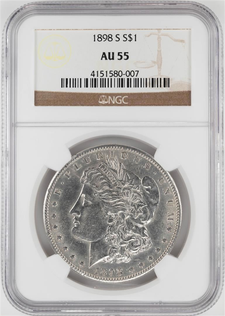 One 1898-S $1 Morgan Silver Dollar Coin NGC AU55. NGC Certified.