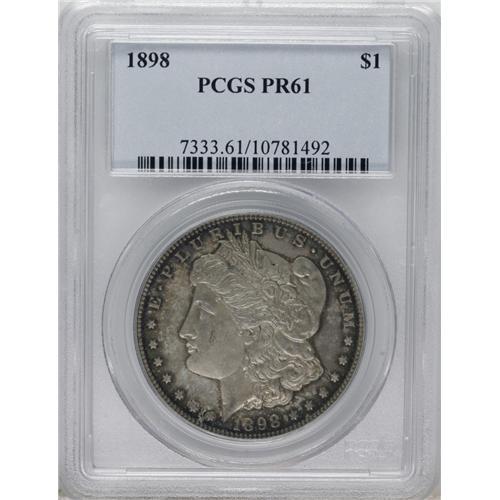 <B>1898 S$1 PR61 PCGS.</B></I> Crisply struck with captivating blue, green, gold, and magenta patina on each side. The hazy surfaces have a number of hairlines and handling marks, particularly on the reverse.<BR><BR><b>Shipping:</b> Coins & Currency (<a target="_blank" href="http://www.heritageauctions.com/common/shipping.php">view shipping information</a>)